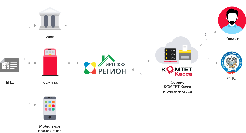 После оплаты квитанции (ЕПД) информация обрабатывается внутри учетной системы «ИРЦ ЖКХ Регион» и передается на сервис КОМТЕТ Касса для автоматической фискализации на онлайн-ккт. Информация о платеже записывается на фискальный накопитель кассы и передается в ФНС через ОФД. Плательщику направляется электронный чек на email или по смс.